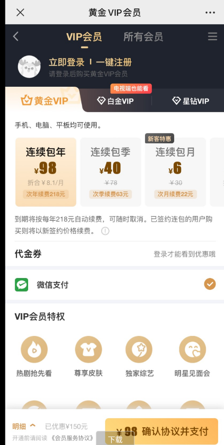 大部分人不管新老用户都是6元一个月,年卡是98一年,都挺划算。