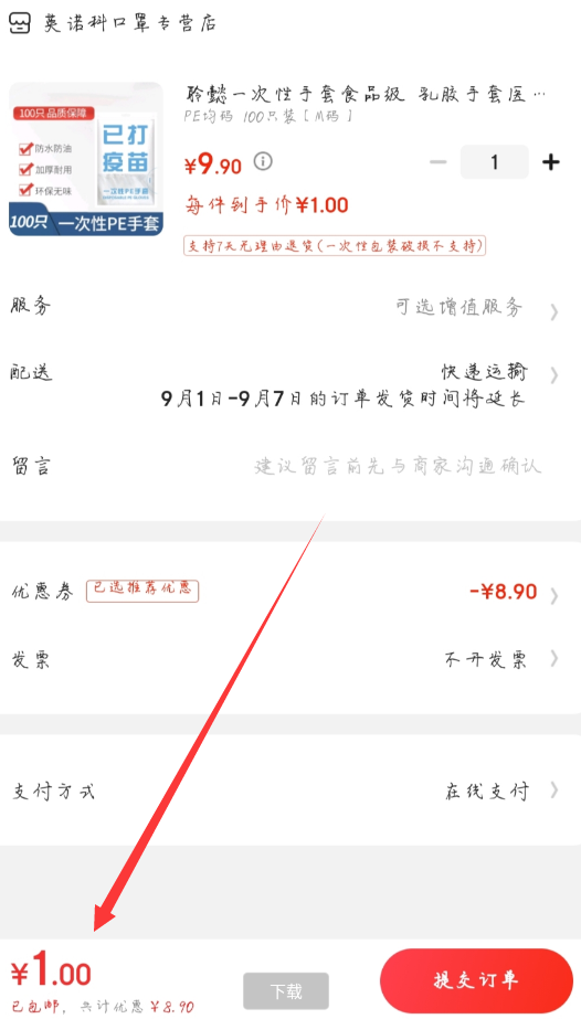 打开地址->领取9.9减8.9元券->抵扣红包后最低0.01元到手->没有红包则一元到手