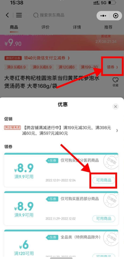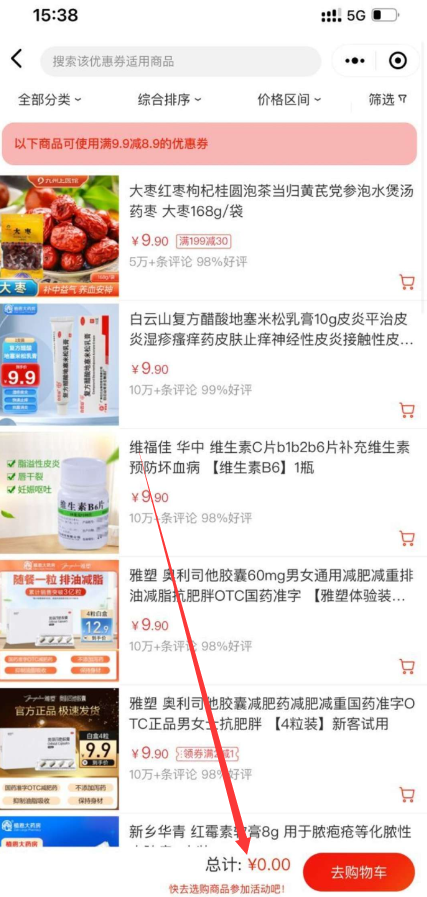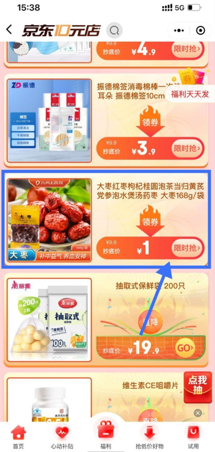【参与方式】微信底部“发现”->点击“购物”进入->10元店进入下拉找到红枣->标题上方领券-可用商品->任选一个9.9的东西抵扣券后1元包邮到手
