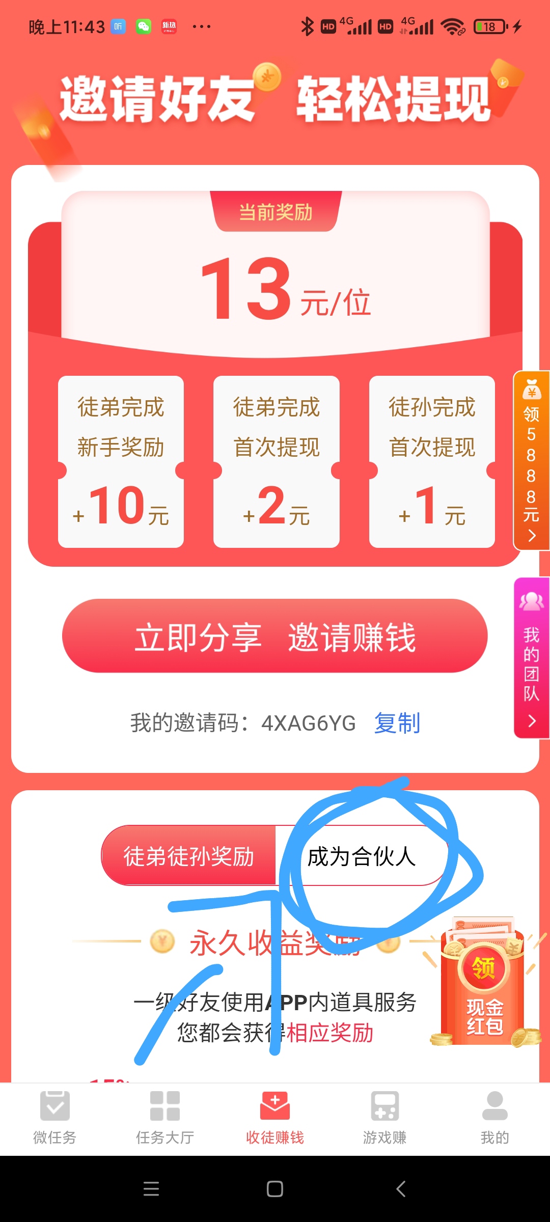 5,推广满50人成为合伙人,合伙人每日上线送分红,下级每天登陆合伙人获得现金奖励。
