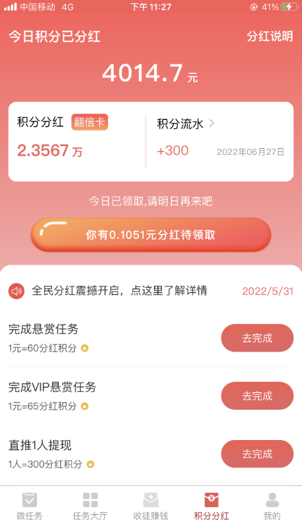 3,注册送1000积分参与分红,做任务+推广可以获得更多积分,每天12点分红,