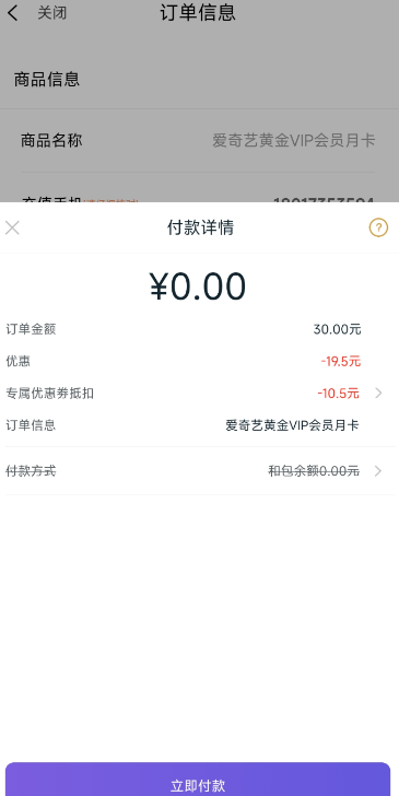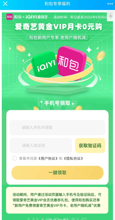 【活动规则】新用户使用和包 购买爱奇艺黄金VIP月卡(原价30元),