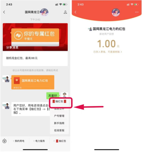 【参与方式】微信关注“国网黑龙江电力”->菜单栏右抽红包->亲测1元微信红包!之前参与过不行!
