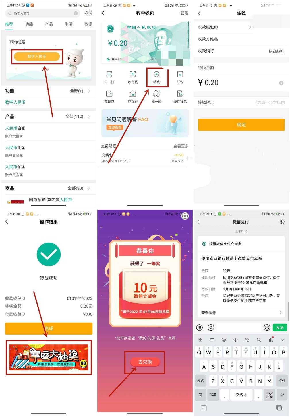 →农业银行APP->搜索“数字人民币”->先充0.02->然后再转张0.02到其他数字钱包