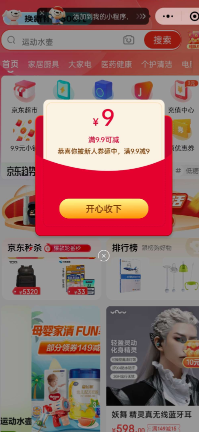 【活动规则】1、微信进入小程序“京东购物”->关闭广告等待5秒,自动弹出9.9减9元券