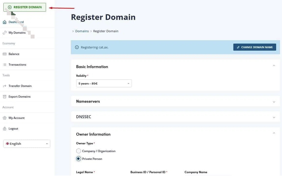最低价格注册:注册商账户提供最低注册价格,1年仅20欧,5年仅85欧,比第三方注册平台便宜近一半。