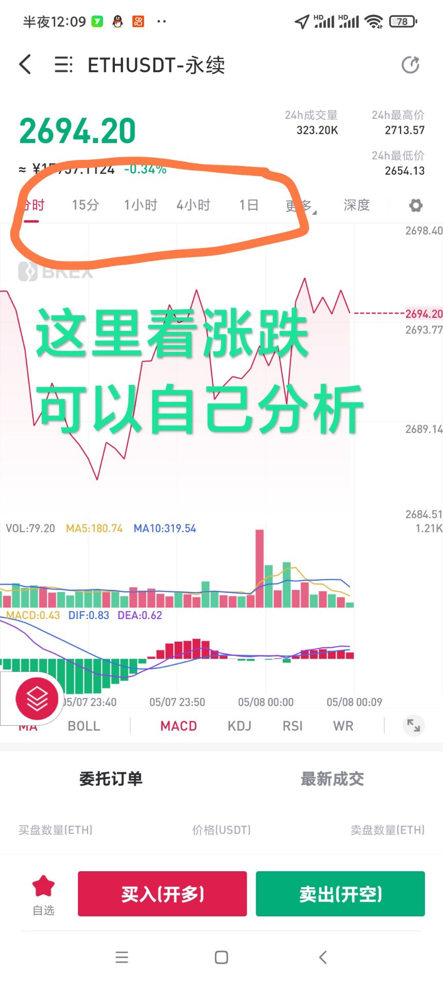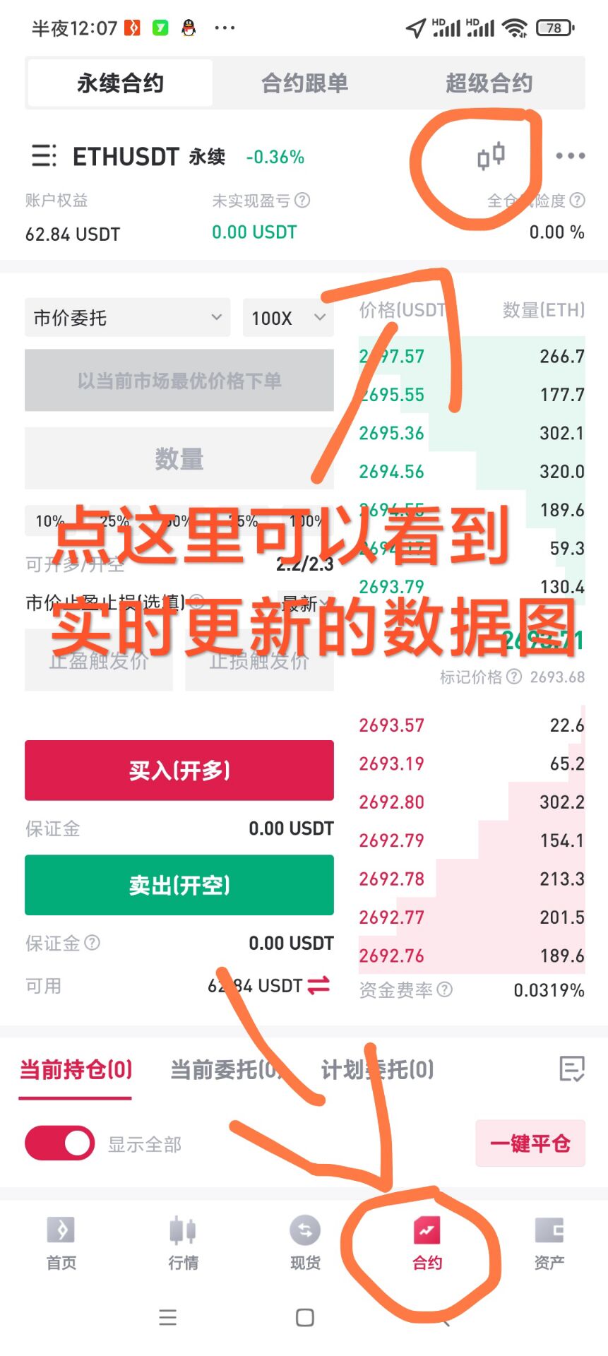 第五步:点击最下方的合约 可以选择买涨就是(买入开多)或者买跌(卖出开空 只要你猜对跌涨就赚钱了!