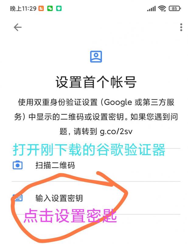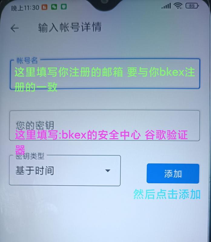 先打开谷歌验证器 点击设置密匙  再填写账户名 和你的密匙 如下图:
