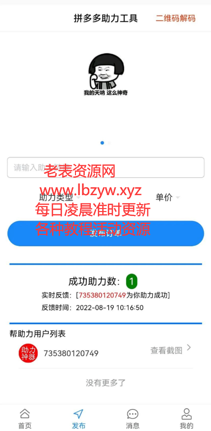 该工具注册后会有一个次数,用户发布助力,如果有人助力则会消耗次数,次数的获取来源于 你帮助别人助力。开发者想借此来实现一个循环,才能实现有人助力,有人发布。该工具主要是想帮助,想砍某多多但好友没有那么多的用户,助他们在成功的道路上多一份成功的希望。软件是纯免费的,无任何充值渠道,请不要相信任何收费等信息。