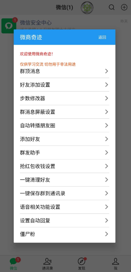 微商奇迹是一款微信多功能辅助应用,主要功能: 消息自动防撤,自动抢包,语音转发,消息自动回复,批量群发,批量清理好友,僵尸粉检测,讲课助手,朋友圈转发等等,此应用以框架内置WX启动,无需卸载官方,安装可与官方共存使用。内置的微信为官方微信,无任何修改,理论百分之九十九防封。已为各位伙伴去除授权验证,版本更新。