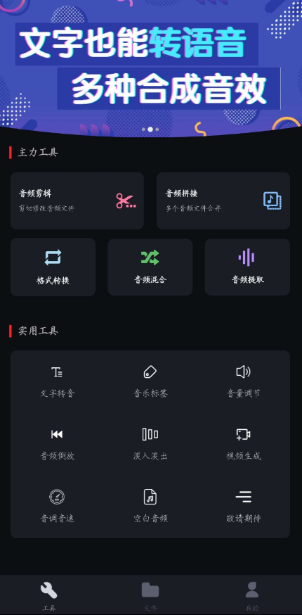 支持的功能全面丰富,是一个功能齐全的多功能音频处理软件,支持的功能包括:音频剪辑、音频拼接、音频格式转换、音频混合、音频提取、文字转语音、音乐标签、音量调节、音频倒放、淡入淡出、视频生成、音调音速、空白音频。