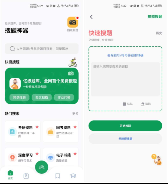 搜题神器是一款免费搜题工具,支持拍照搜题和文本搜题,支持查看热门网课答案,还能搜索各种学习资料,例如考研、国考、深度学习、电子书籍、教程、电影等资源。