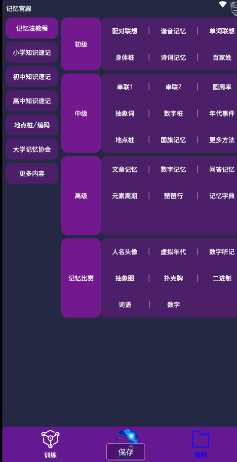 记忆宫殿安卓版提供快速记忆,知识点联想记忆,比赛项目训练和综合记忆训练等方法对用户的记忆力进行锻炼,对用户大脑记忆进行极限挑战,只有在极限的环境下才会爆发出惊人的效果。