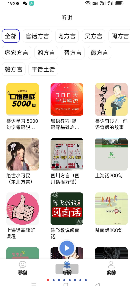 【资源介绍】:首先,软件使用非常的方便,在学说页面汇集了粤语,上海话,闽南话,客家话,长沙话,苏州话,太原话,屯溪话,南昌话,桂南平话等等。在听讲页面,这里有各个地方的基础语言,方言等等,普通话和粤语切换教学,单句教学,学习很轻松。例如想学粤语,选中点开,都是高质量的语音播放,有礼貌用语,日常用语,生活用语,日常应对,生病就医,出行交通,邮电银行,观光旅游,子女教育,逛街购物,餐饮烹调等等,完全能满足各种交流需求。软件免费使用。