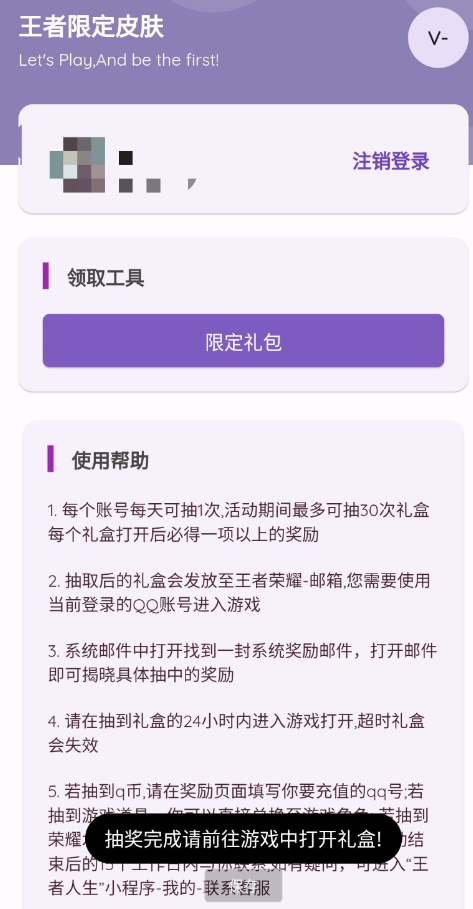 一键抽取王者限定皮肤礼盒,每天1次,活动期间最多可抽30次礼盒