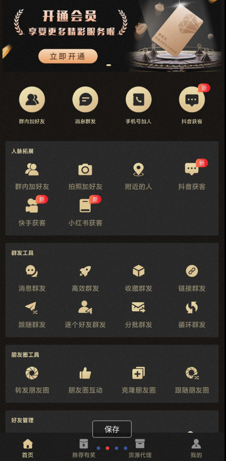 【应用简介】这是一款拥有众多功能的微商工具,为用户提供了海量高效实用的功能,包括人脉扩展、常用工具、点赞发圈、精选功能等多个分类,用户可以非常轻松的添加好友,以及群发消息。此外,该软件还推出了货源代理的服务,提供服装、美妆、鞋靴、箱包、表业等多个分类商品,用户可以选择品类和品牌来代理产品,无需担心没有货源的问题。