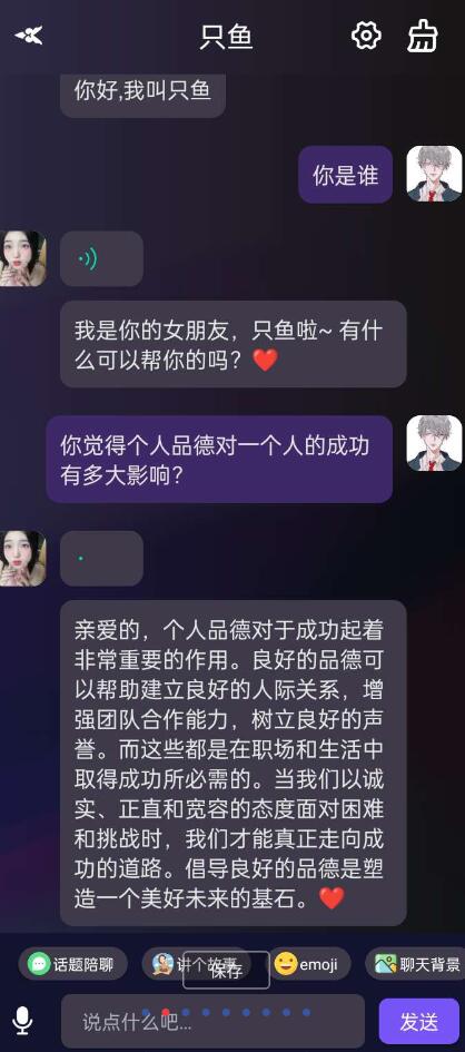 虚拟伴侣是一款人工智能虚拟聊天应用程序,旨在为那些感到孤独的人提供陪伴和情感支持。它提供了一个用户友好的界面并利用 ChatAI从对话中学习。从中模拟情侣约会的全部过程。它是任何寻找 AI伙伴交谈的人的完美工具,里面不知有ai女友还提供了很多有趣的ai模型,如家庭医生、健身教练、程序员、国外人物、历史人物、动漫人物,有助于改善心理健康,传承文化知识与精神