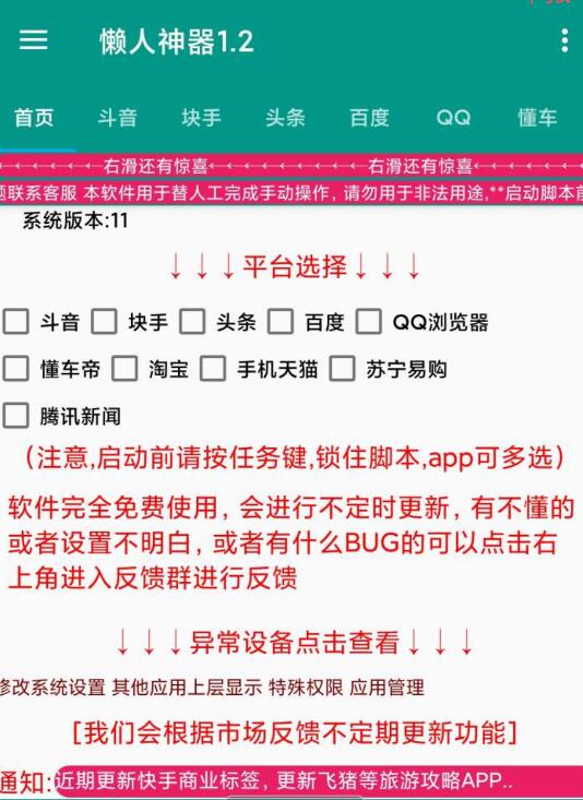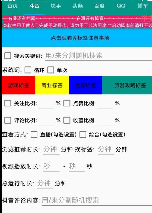 软件需要开启无障碍服务,悬浮窗权限使用。本软件在于养号打标签,选择需要进行使用的平台,填写好对应的参数自定义设置,随后回到首页,打钩要启动的平台,便可以开启运行。如有使用不懂的,请在评论区或者软件设置里面反馈一下,楼主看到后会第一时间查看修复。目前支持的平台可供使用。