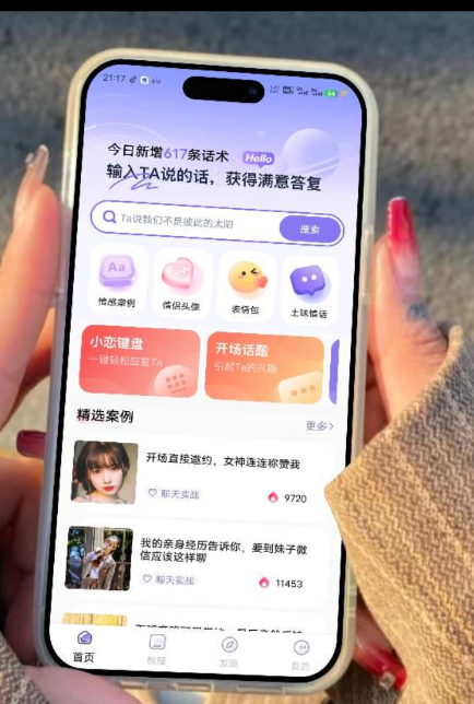 【软件介绍】一款恋爱聊天软件,这里有着海量的聊天技巧,1万+土味情话语录,土味表达让感情更进一步,40万+聊天话术;搜索对方的话,找到粘贴即可轻松回复,海量的话术供您搜索,帮助解决聊天中各种实际问题。