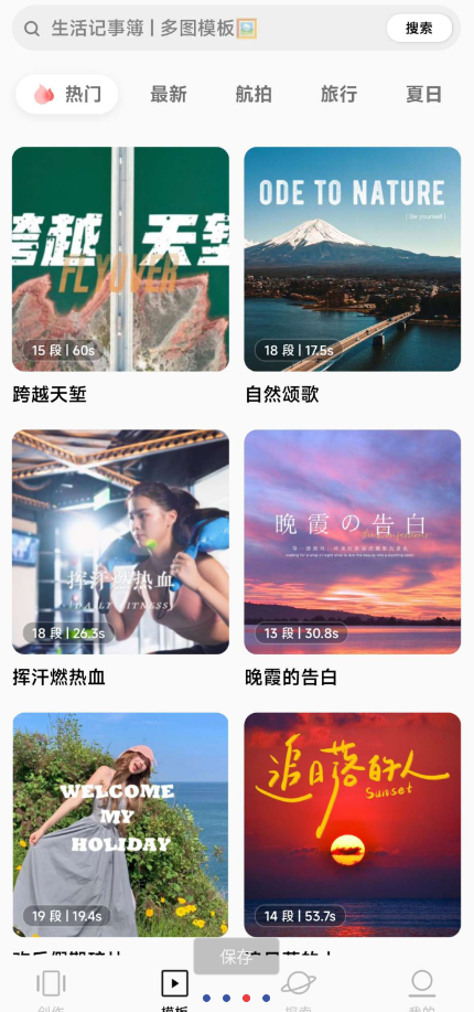 『丰富的创意模板』热门视频模板、VLOG、航拍、旅行、卡点视频模板、萌娃、生活、艺术、照片模板等不同风格视频模板,总有一款适合你。 『操作简单,持续更新』选择喜欢的模板,点击一下,一键导入视频片段,精美大片即刻生成。
