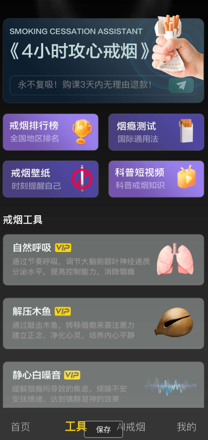 【官方介绍】:获百万烟民认可的戒烟神器,数字化心理学戒烟先行者,可以帮助吸烟者简单轻松无感戒烟,4小时攻心戒烟法,是你戒烟成功的终点站! 【戒烟跟踪】 全程记录你的戒烟时间与数据统计,根据你戒烟的时间生成数据画报:已少抽N根香烟,已节省N时间,已节约N金钱等。。。让你的戒烟情况用数据说话 【戒烟方法】 运动缓解:跟随教程运动缓解放松,通过对(肺部锻炼,闭气练习)等进行掌控 心理解压:佛性解压放松,调节心性,忍不住想抽烟,敲一敲木鱼,盘一盘佛珠,立马打消抽烟念头 白噪音:通过音乐安抚情绪,注意力转移,解除心瘾,掐灭烟头。 4小时攻心戒烟:烟瘾主要是心瘾,戒烟关键在于彻底去除心瘾,从而消除吸烟欲望,确保永不复吸 戒烟永远不会太晚,现在就开始你的无烟之旅,享受你作为一个快乐和健康的非吸烟者的生活吧! 祝你戒烟成功! 戒烟助手2024