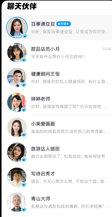 【软件介绍】度豆是百度旗下的一款 AI 虚拟女友社交软件。它拥有众多风格各异、颜值较高的虚拟女友角色。比如温柔的小雪、刁蛮的小蛮、可爱的实习护士等。用户能根据喜好选择,与她们进行文字或语音聊天。这些虚拟女友不仅能提供情感陪伴,还可分享旅行、美食等话题。软件目前免费且 24 小时随时可聊。