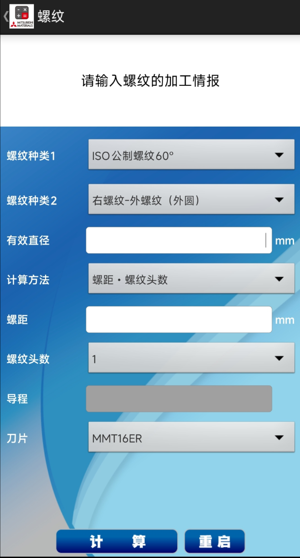 【软件介绍】:此软件用于为三菱综合材料所提供的硬质合金刀具的切削加工计算。计算时只需要将数值输入,即可自动计算出主轴旋转速度及切削速度等。此外,也可对应逆计算,简单得求取数值。以下为菜单。・铣削加工计算公式・车削加工计算公式・钻孔加工计算公式・螺纹加工计算公式・主页・web版产品目录・电话技术咨询・通过web进行技术询问・加工计算公式表