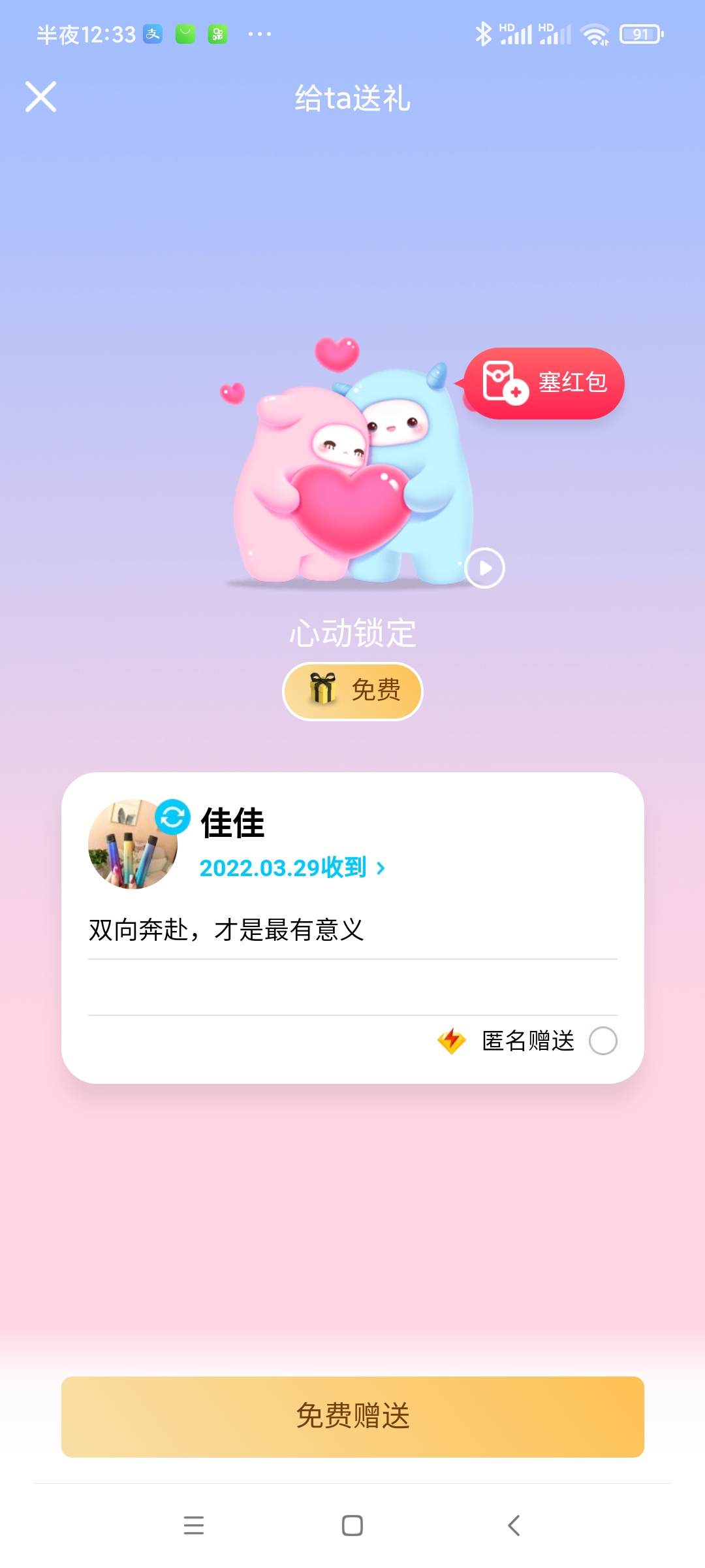 这个代码是我抓包出来的,每进去一次就可以送一次,配合黄鸟抓包可实现自动发送,