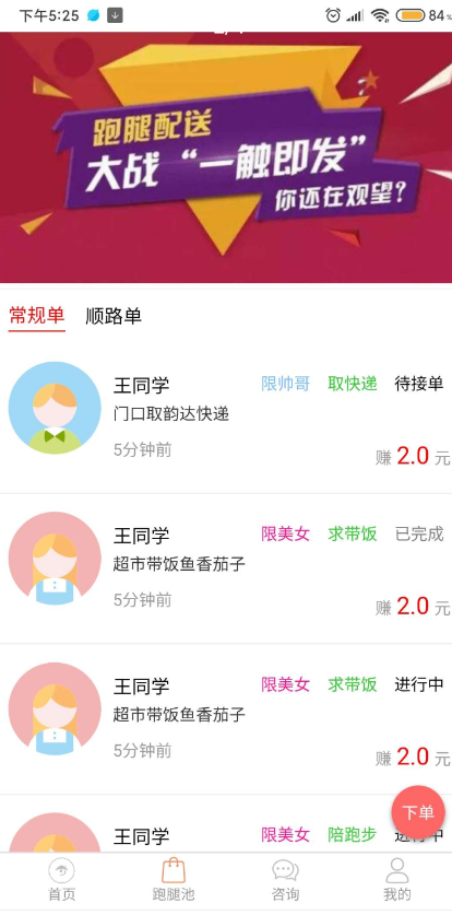 首页、跑腿池、咨询、通知、通知详情、我的、下单界面、抢单界面、收货地址界面、添加收货地址界面、发布的订单界面、抢单的界面、账户管理界面、我的积分、联系我们界面、实名认证界面、登录界面、注册界面、修改密码界面、忘记密码、优惠券。